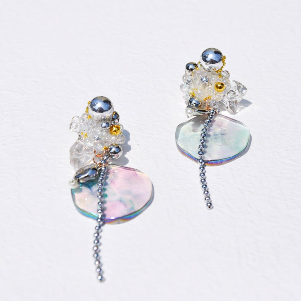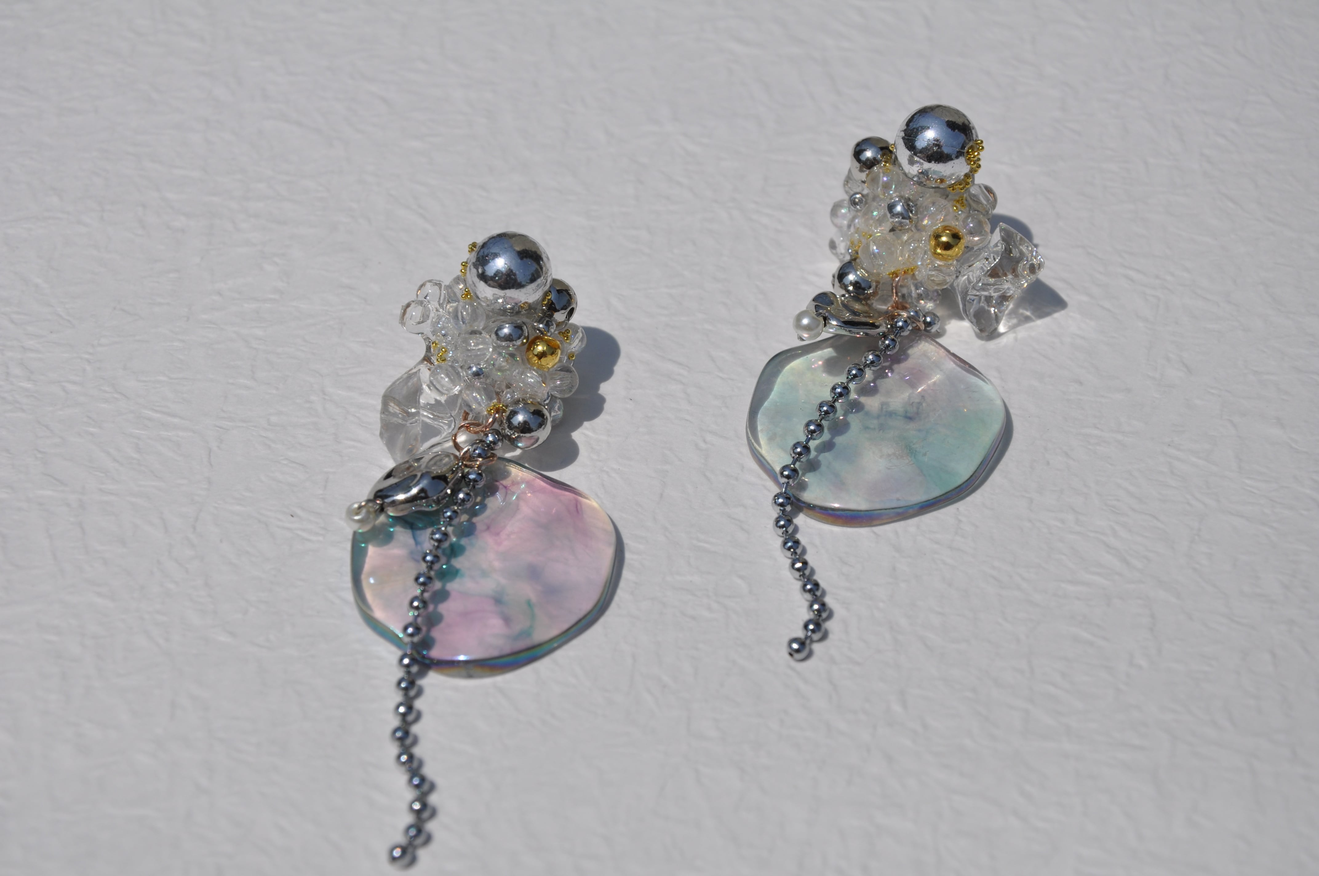 を刺繍し、シャボン玉のような水面のような風合いの波パーツにシルバーの変形パーツとパール・ボールチェーンで仕上げたイヤリングです